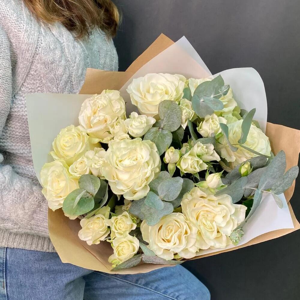 Роза Эквадор – 7 шт.Роза кустовая – 2 шт.Эвкалипт – 2 шт.Упаковка дизайнерская – 5 шт.Лента атласная – 1 шт.Лизиантус – 2 шт.