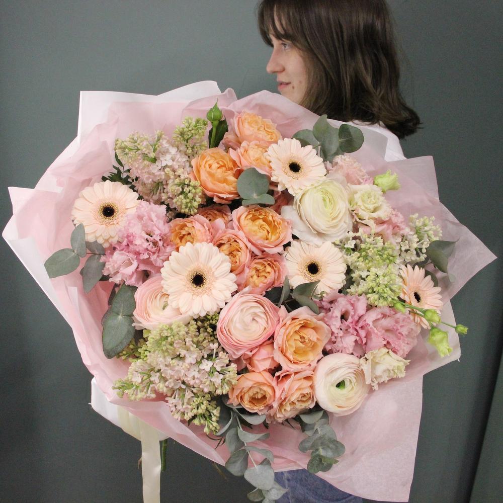 Лизиантус – 3 шт.Гербера – 5 шт.Роза кустовая пионовидная – 4 шт.Эвкалипт – 9 шт.Упаковка дизайнерская – 2 шт.Ранункулюс – 5 шт.Упаковка – 1 шт.