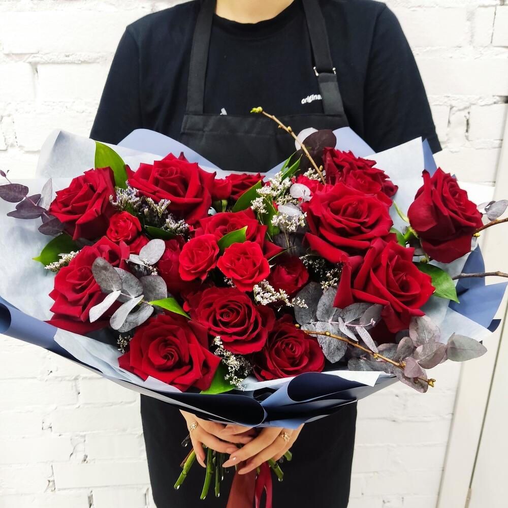 Лимониум – 3 шт.Роза кустовая – 4 шт.Рускус – 15 шт.Роза – 9 шт.Роза Кенийская – 6 шт.эвкалипта – 6 шт.Упаковка дизайнерская – 1 шт.Лента атласная – 3 шт.