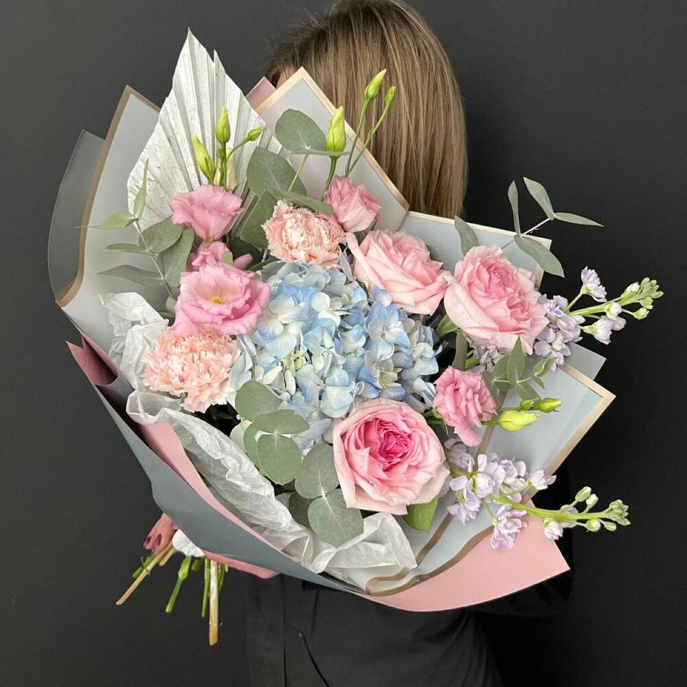 Гортензия – 1 шт.Лизиантус – 2 шт.Маттиола – 2 шт.Эвкалипт – 2 шт.Диантус – 2 шт.Роза пионовидная – 3 шт.Упаковка дизайнерская – 3 шт.Лист пальмы – 1 шт.