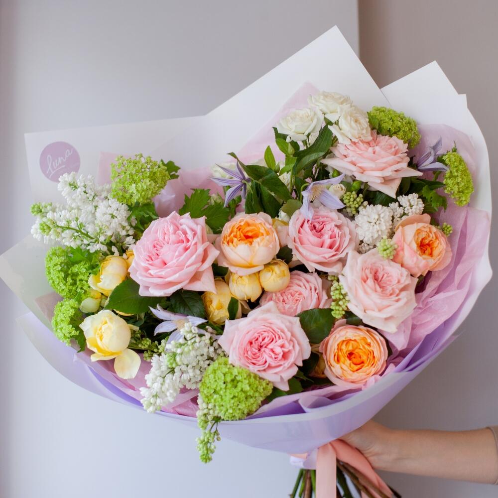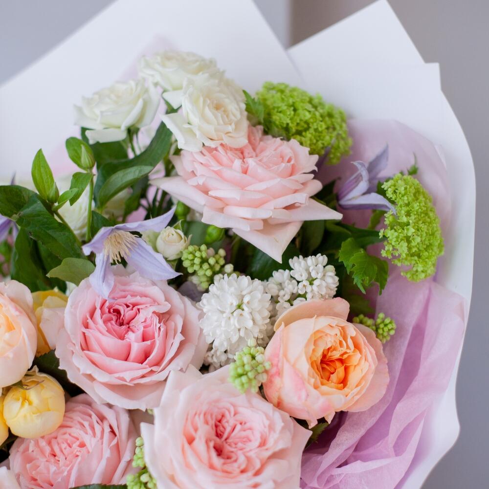 Пышный ароматный букет с весенней сиренью, пионовидными розами Хитоми и Айко, сливочной кустовой розой Лимончелло и салатовым Вибурнумом
