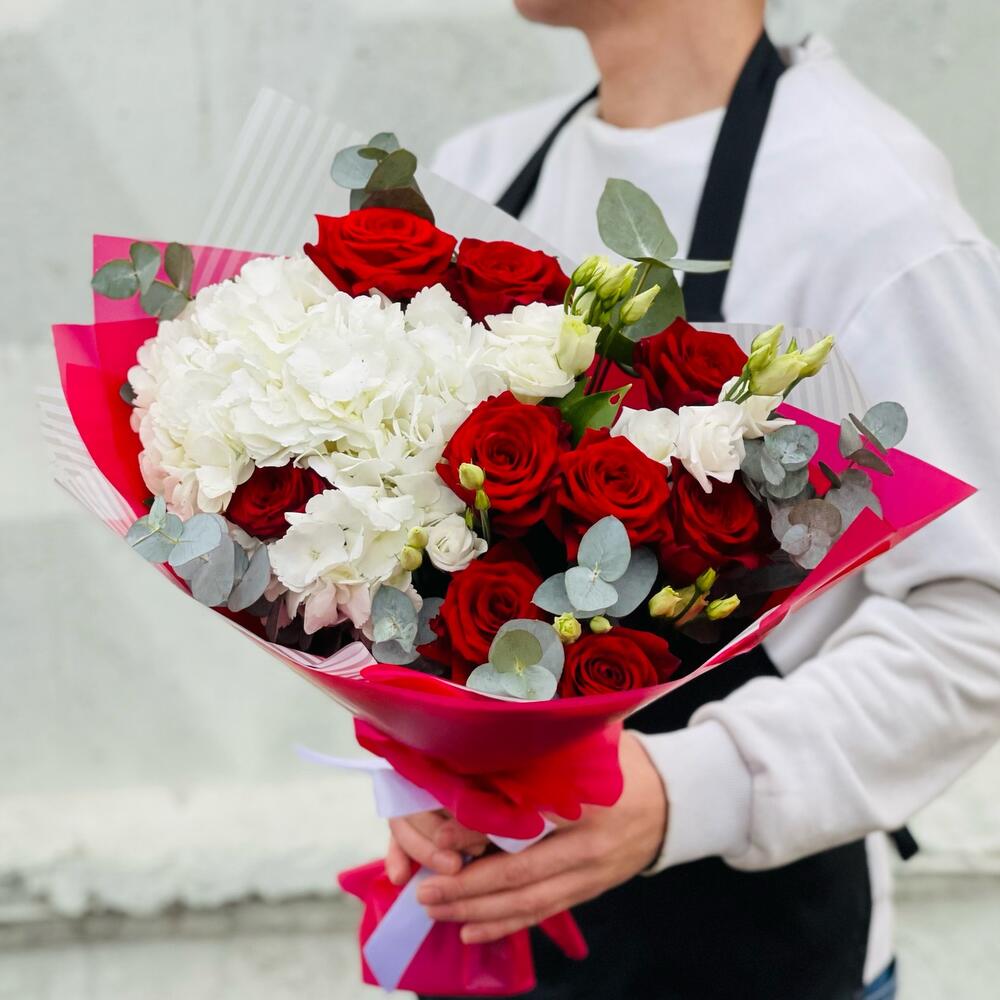 Гортензия – 1 шт.Роза красная – 9 шт.Рускус – 10 шт.Эвкалипт – 3 шт.Эустома – 5 шт.Лента атласная – 1 шт.Упаковка дизайнерская – 5 шт.