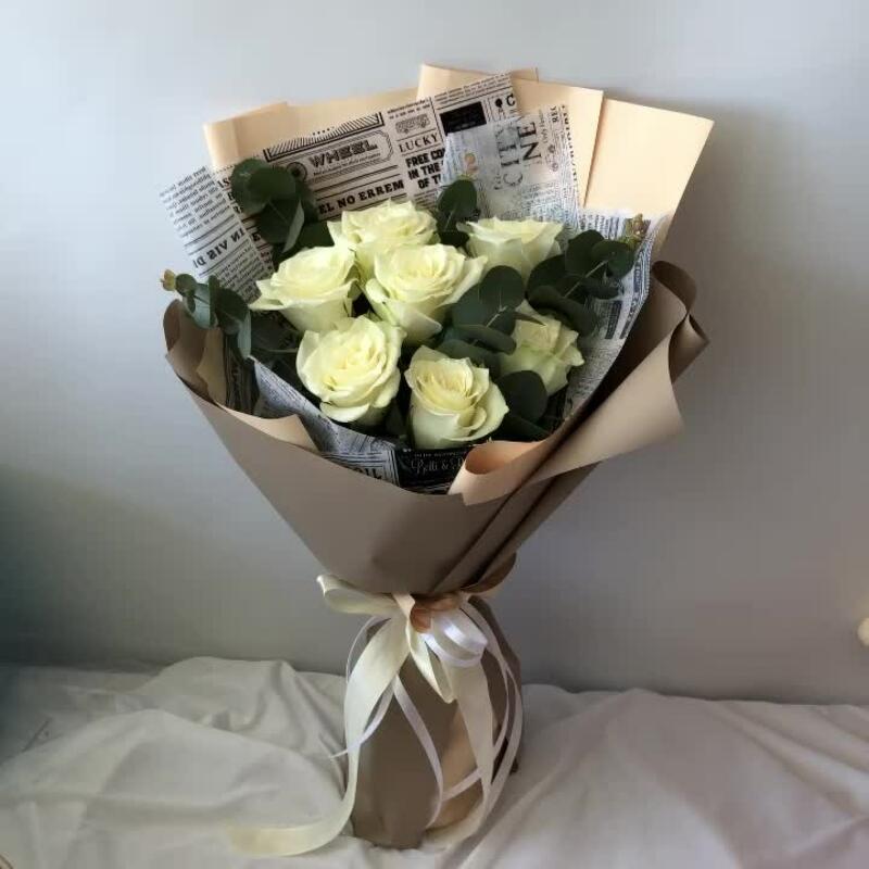 Семь белых роз с эвкалиптом