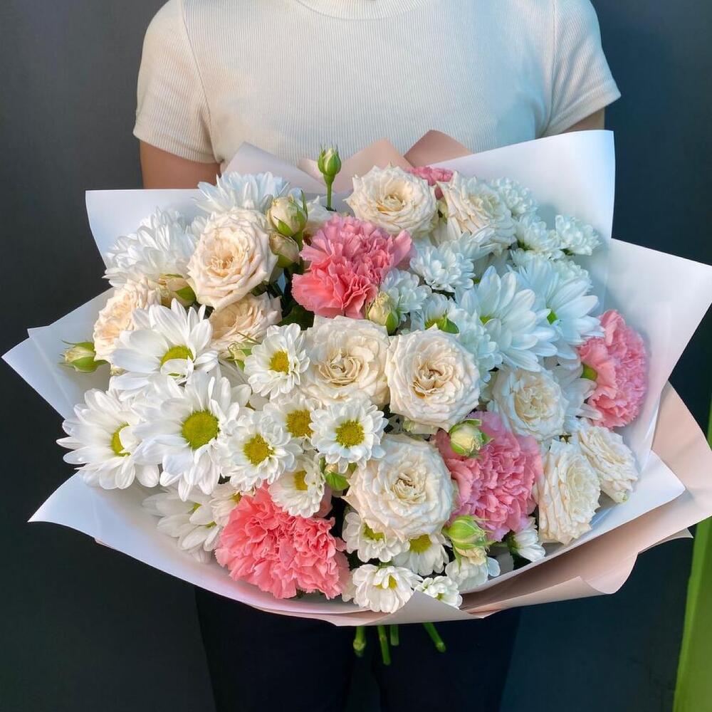 роза кустовая таня – 3 шт.Диантус сортовой – 5 шт.Хризантема кустовая белая – 3 шт.Сантини белая – 5 шт.Упаковка дизайнерская – 1 шт.
