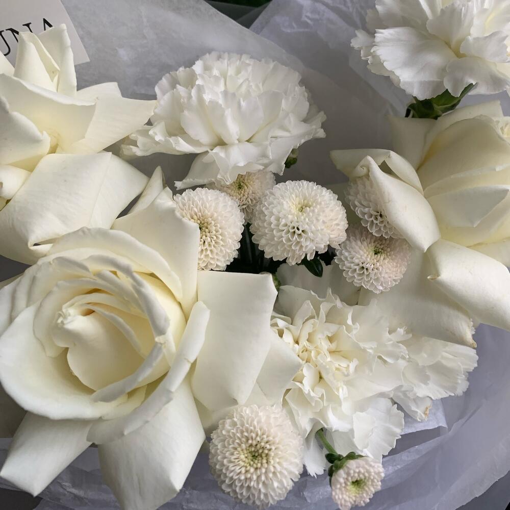 Лента атласная – 1 шт.Гвоздика белая – 4 шт.Кризал (подкормка) – 1 шт.Аквапак – 1 шт.Дизайнерская упаковка – 2 шт.хризантема coconut – 1 шт.инструкция по уходу за цветами – 1 шт.роза playa blanca – 3 шт.транспортировочная упаковка – 1 шт.
