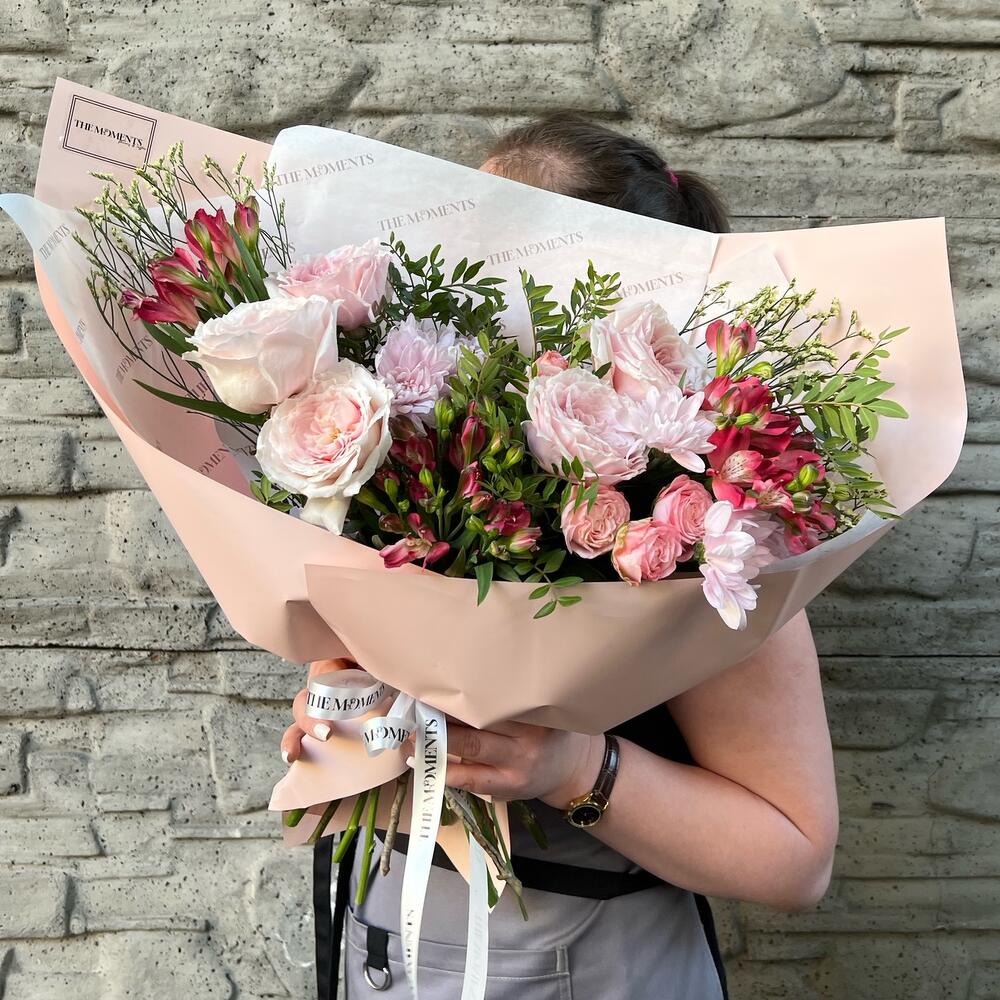 Альстромерии, Гвоздики, Кустовые розы, Лизиантусы, Розы, Хризантемы