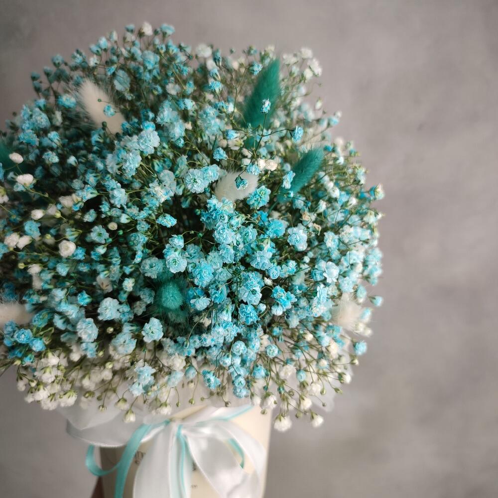 Коробка – 1 шт.Оазис флористический – 1 шт.Гипсофила – 7 шт.Лагурус белый – 8 шт.лагурус бирюзовый – 7 шт.