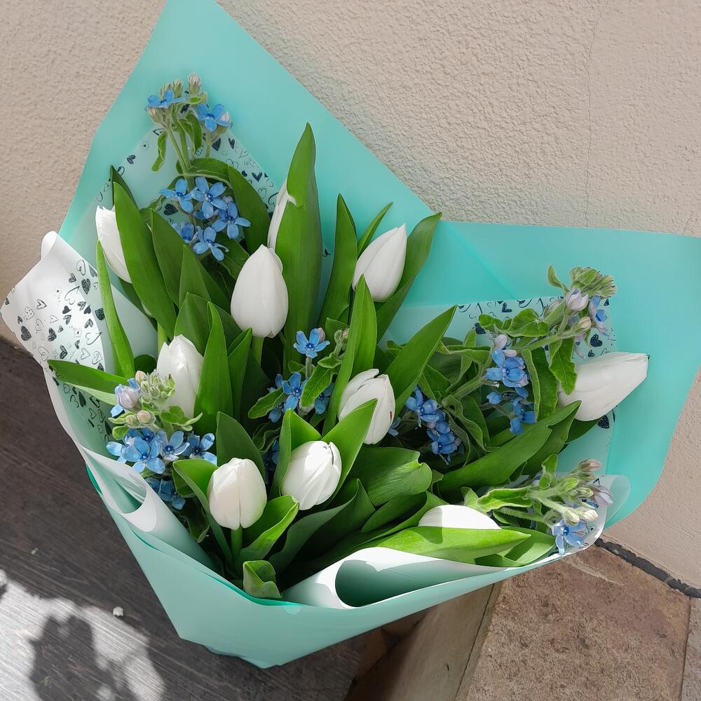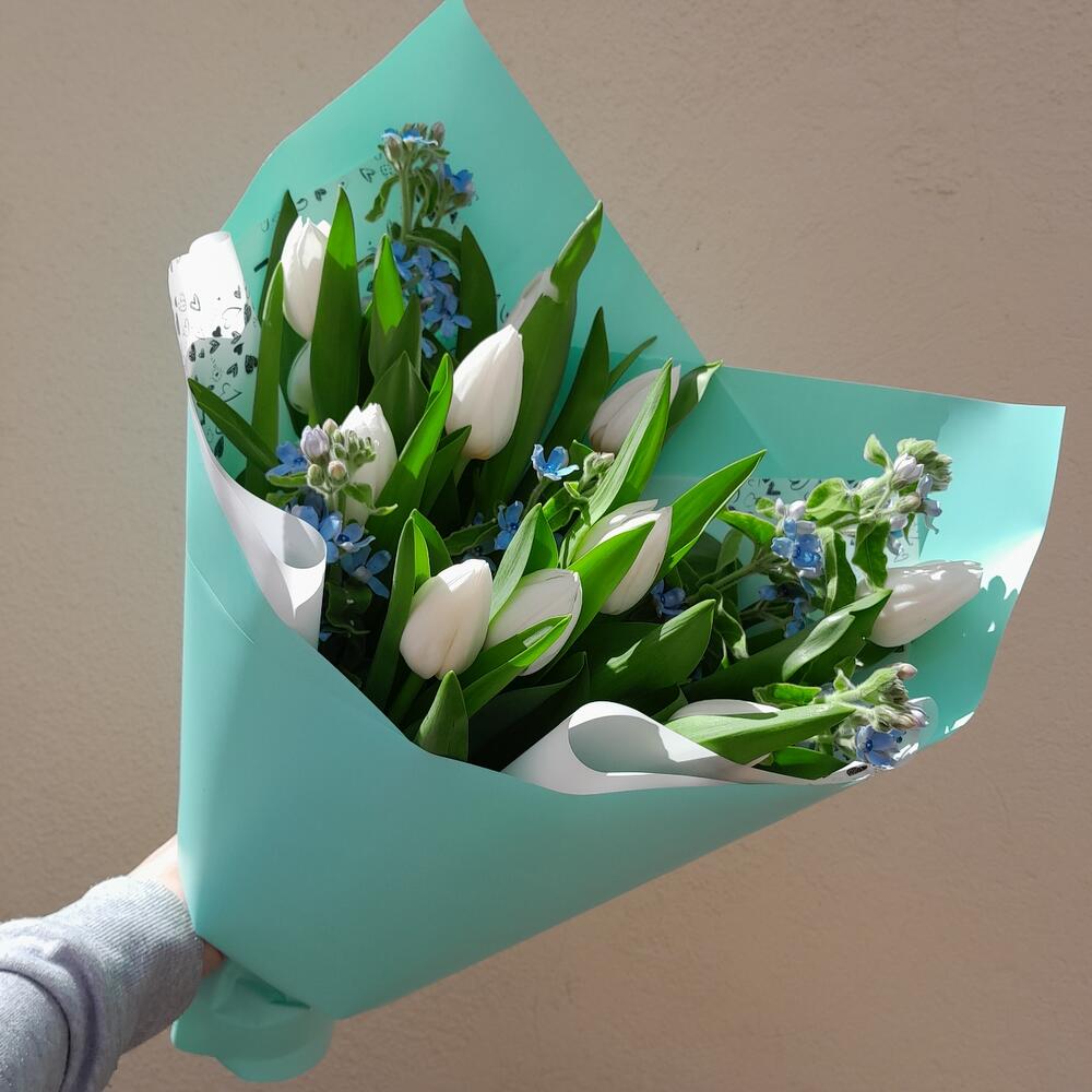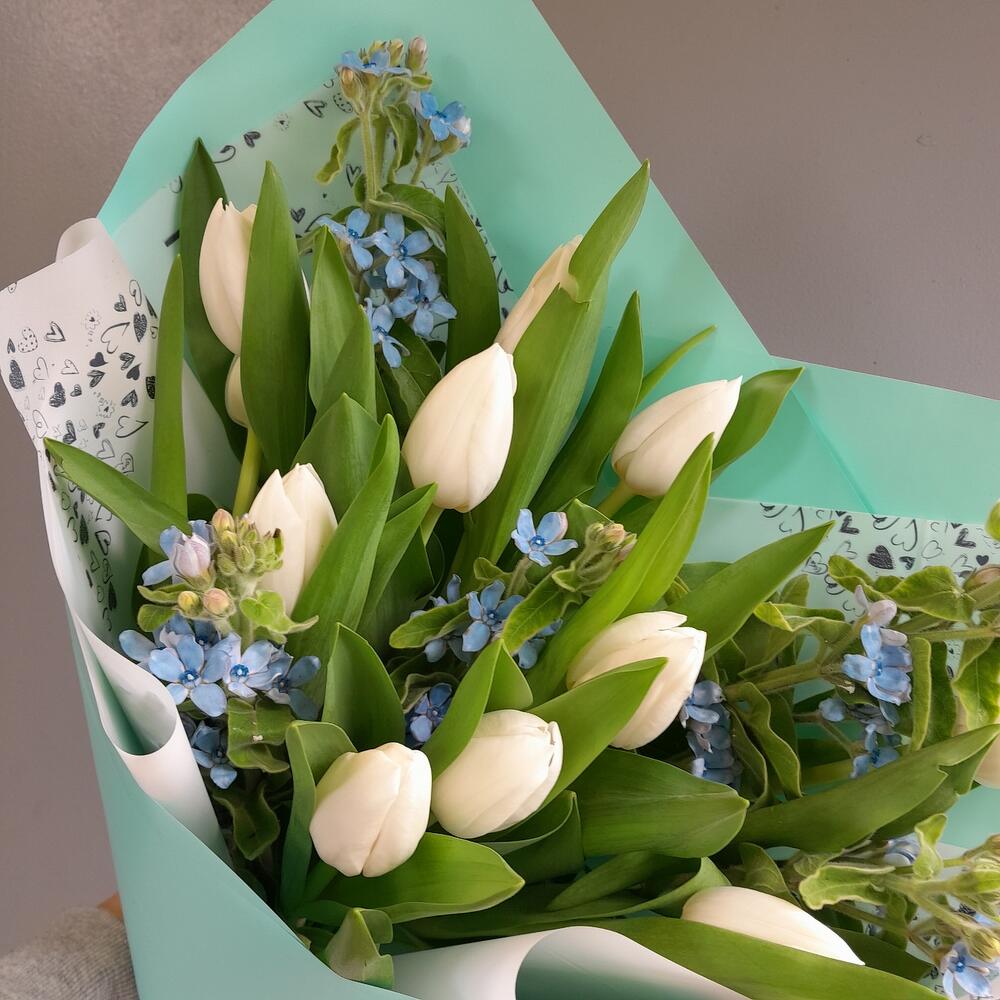 Тюльпан – 11 шт.Оксипеталум – 5 шт.Упаковка дизайнерская – 3 шт.Лента атласная – 2 шт.