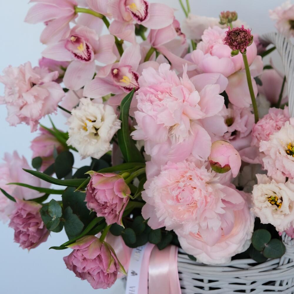 Гортензия – 3 шт.Тюльпан – 22 шт.Эвкалипт – 5 шт.Ранункулюс – 6 шт.Пион Сара Бернар – 10 шт.Оазис флористический – 2 шт.Ранункулюс ханой – 8 шт.Цимбидиум розовый – 1 шт.корхина плетеная – 1 шт.лизиантус пинк махровый – 5 шт.